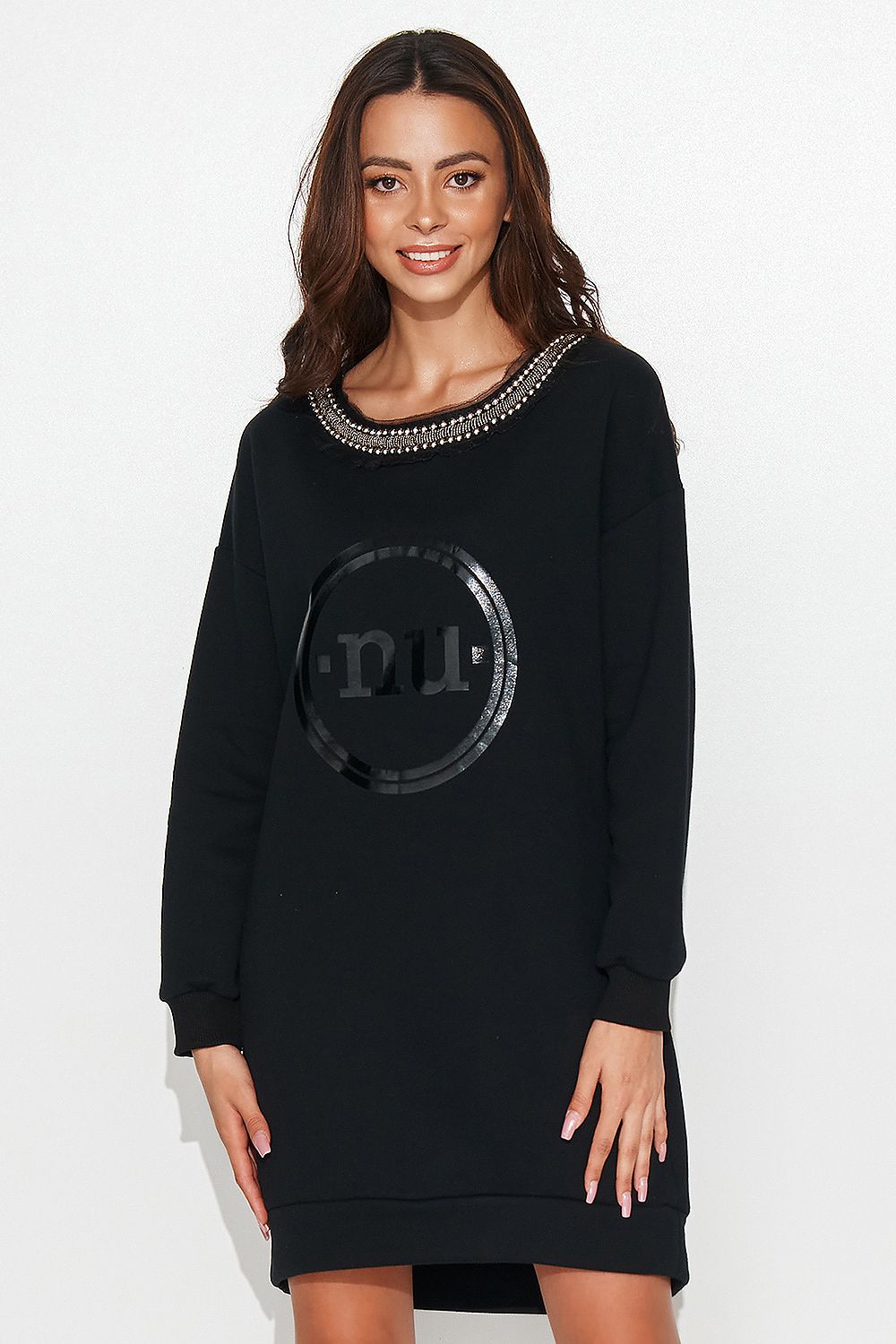 فستان عرق يصل إلى الركبة. يبدو مثل قميص نسائي مطوية فوق رأسها. يتميز بشعار Numinou القابل للكي على الجهة الأمامية. يتميز هذا الفستان بزخارف من الدانتيل واللؤلؤ على خط العنق المستدير. من الداخل، يتم عزل القماش بقطيفة ناعمة، وهي لطيفة أيضًا على البشرة. تم تصميم الأكمام الطويلة مع حاشية مضلعة قياسية. بفضل مزيجه بين الأسلوب الرياضي والأنيق، يعد هذا الفستان الحل الأمثل للتنسيق في العمل أو في أي مكان آخر. استمتع بالراحة بأسلوب فريد من نوعه. الفستان متوفر باللون الأسود.