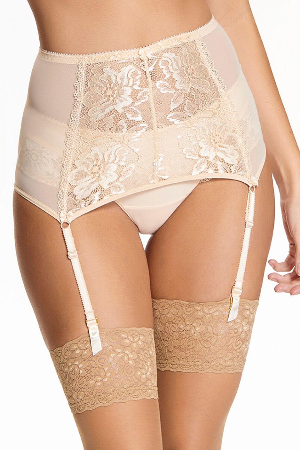 High-waisted suspender belt in beige, made of soft tulle mesh. Front decorated with elegant and delicate embroidery, smooth tulle mesh back, adjustable hook-and-eye closure.
