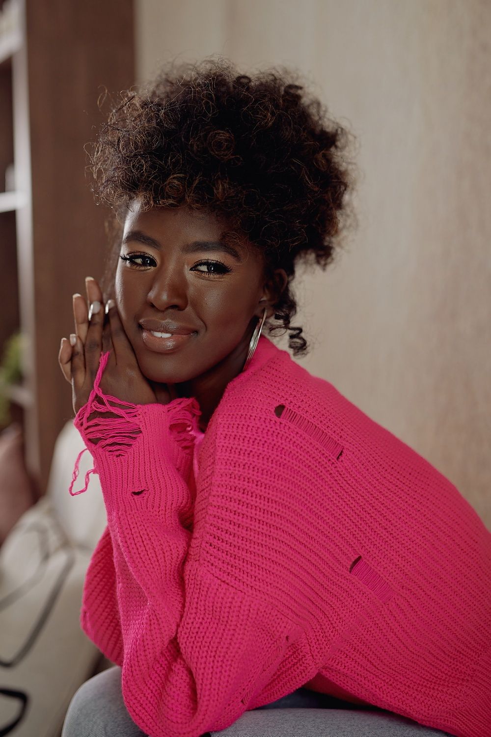 This oversized black sweater will look perfect paired with high-waisted pants. The sweater features raw-edged, hole-trimmed bottoms.