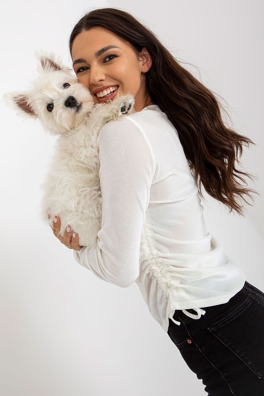 Short velvet blouse with long sleeves and a round neckline. Side ties allow for length adjustment.
