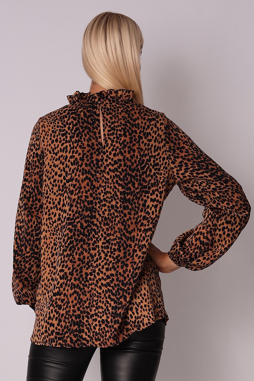 Take a walk on the wild side with our camel animal print ruffle long-sleeve blouse. It features long elasticated sleeves, a low collar, and a button closure at the neckline. Crafted from a lightweight fabric, it has a relaxed silhouette. Pair with black jeans for a casual everyday look or black tailored trousers for a smart office look.