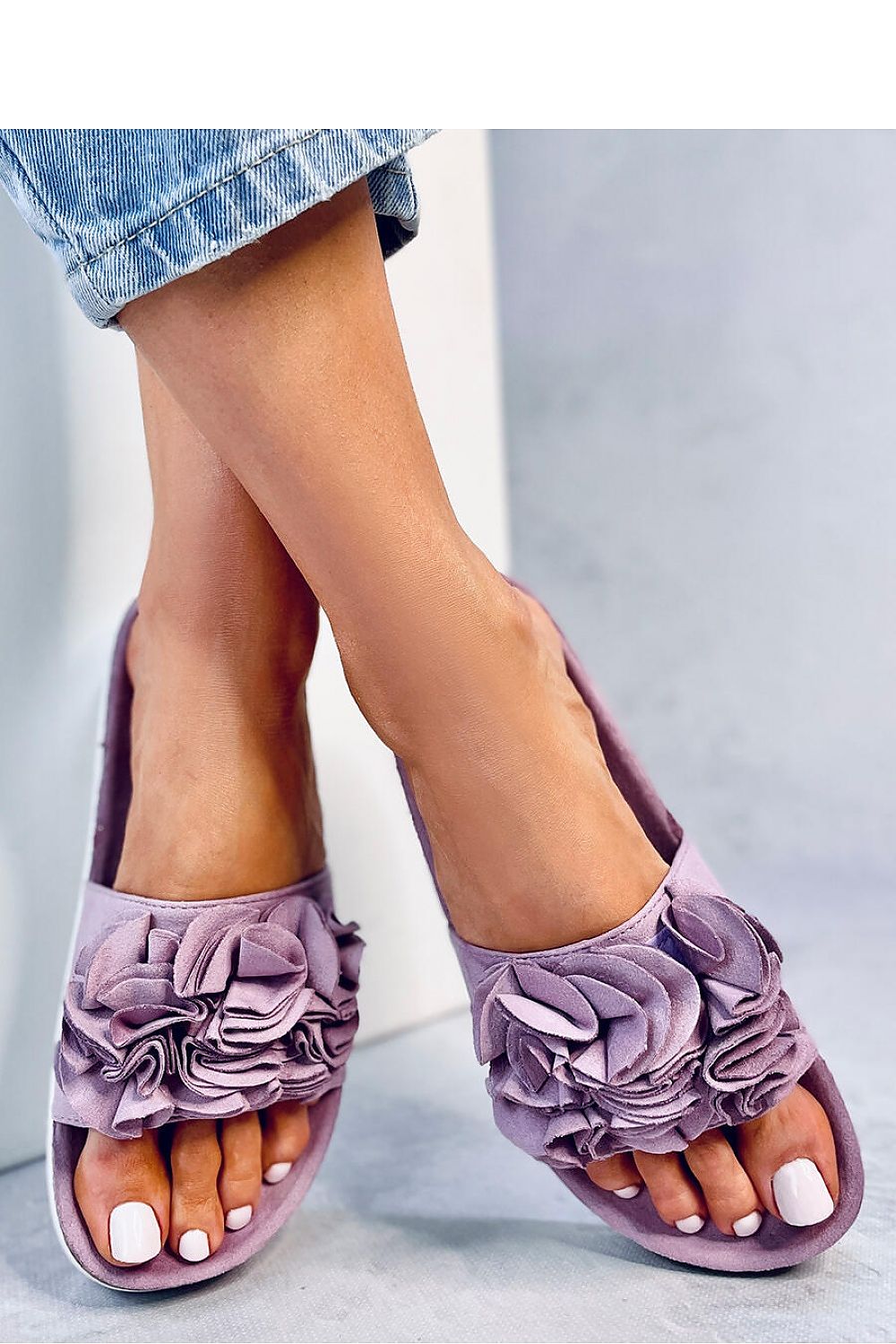 Women's flip-flops with a 4 cm high sole. They are unique thanks to the floral appliqué, which is sure to delight your hearts : ) The contoured insole will make you want to take them with you every time you go for a walk on vacation : ) Outer material? Eco-friendly suede.