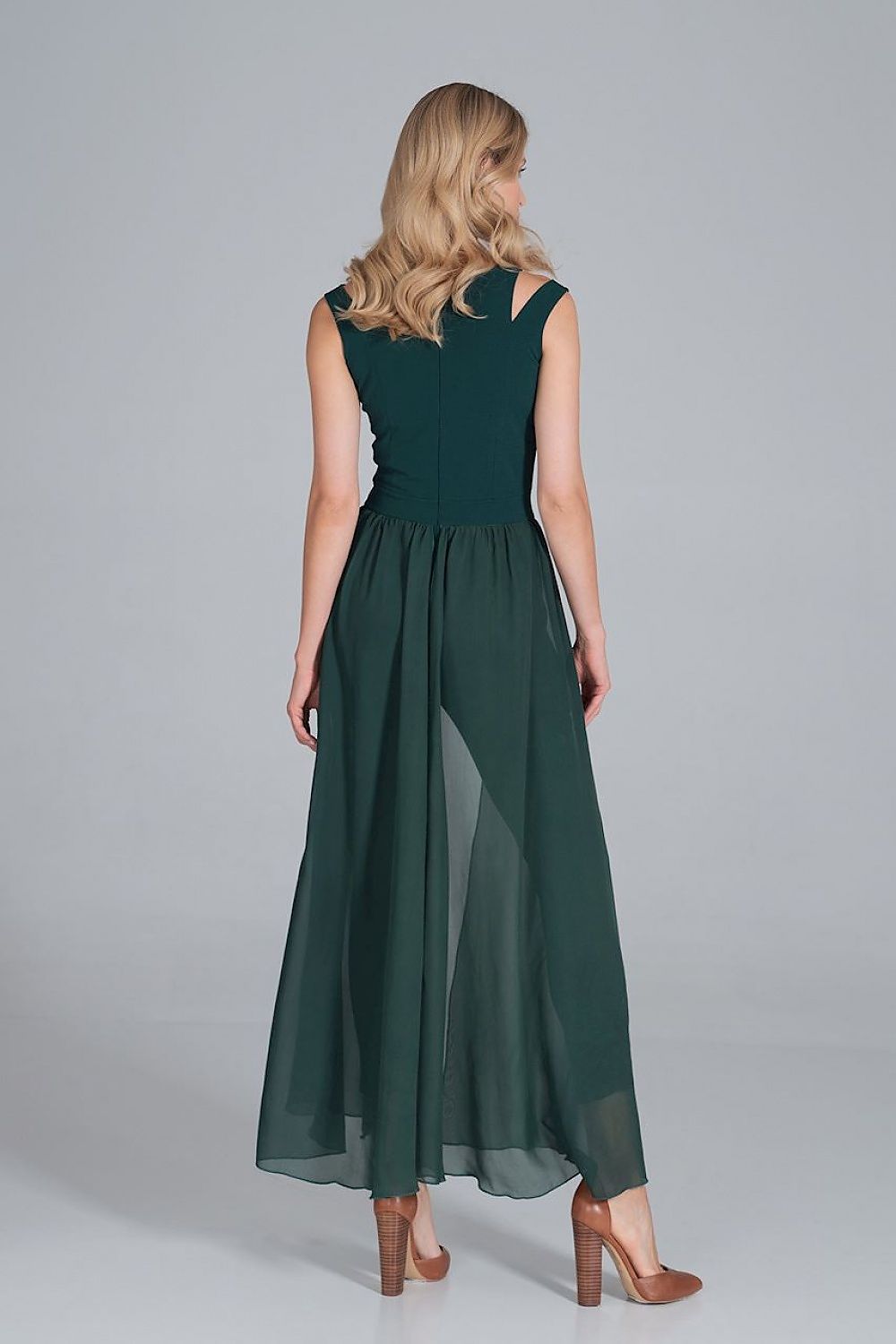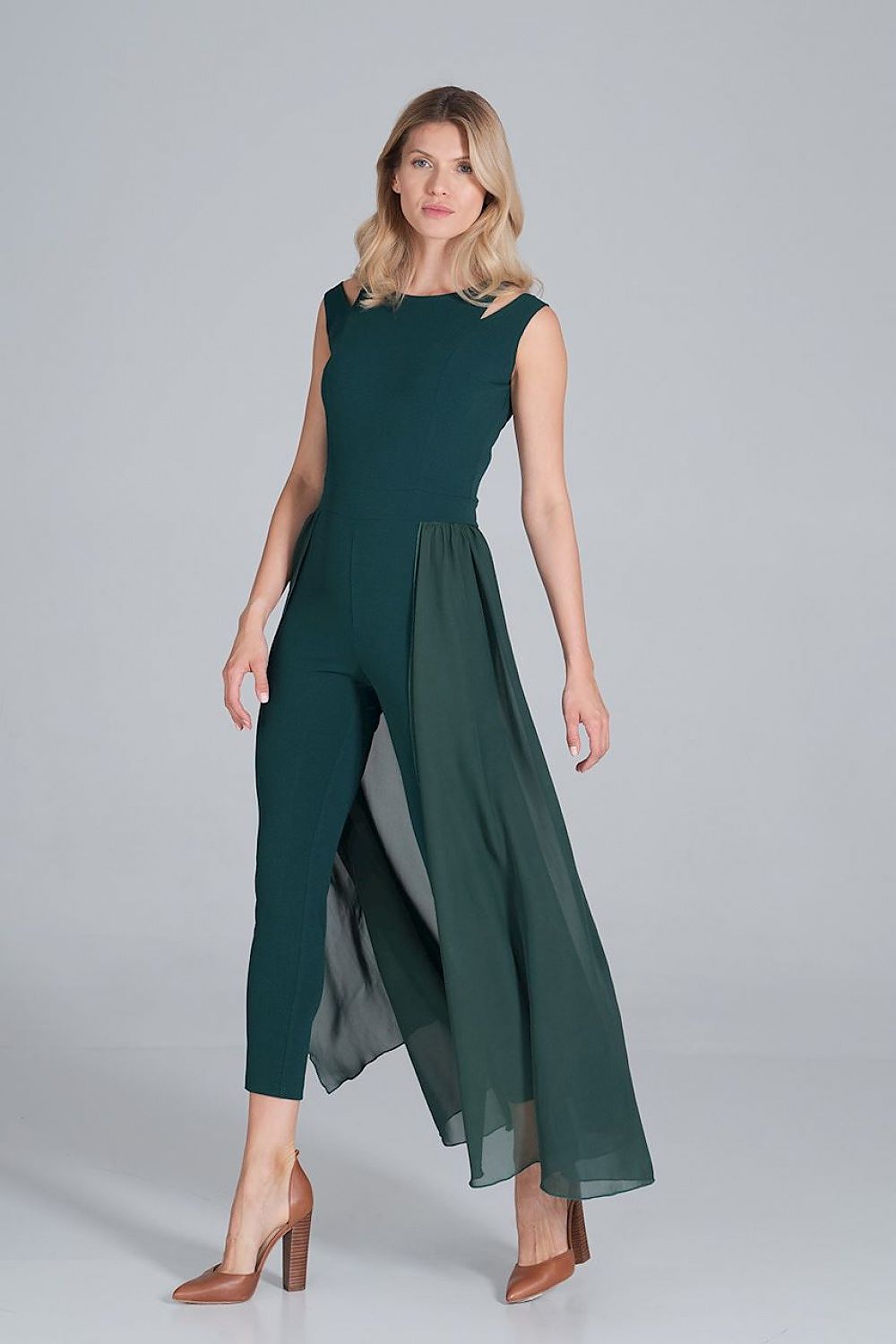 Jumpsuit with a long chiffon skirt with a back slit. Sleeveless, with delicate decorative slits at the shoulders and a small semi-circle neckline. Tapered legs at the bottom. Back closure with a long covered zipper.