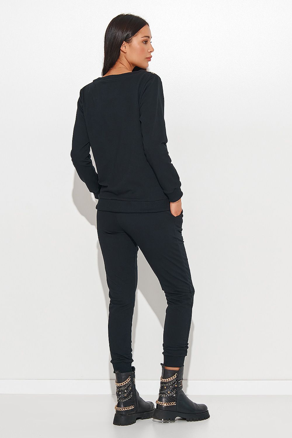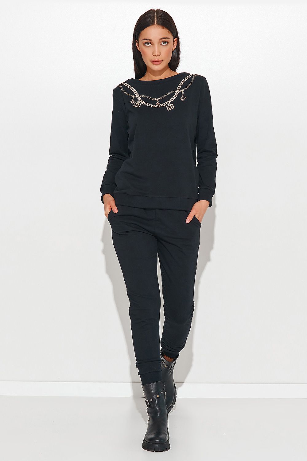 This women's sweatshirt set includes classic pants and a sweatshirt worn over the head. The sweatshirt has a round neckline finished with fine piping. This element is also found on the distal part of the sleeves and around the waist. The sweatshirt is decorated with a beautiful chain embroidery on the front. There are also sparkling crystals on the shiny thread. The pants are straight, with slanted side pockets and braids at the waist and the ends of both legs. The set is available in the following colors: cream, cappuccino, light beige, and black. Perfect for everyday use, as well as for work. Can be worn with elegant stilettos or sneakers.