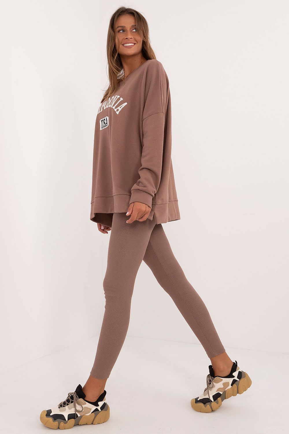 A casual women's sweatshirt and leggings set, ideal for everyday wear. The long-length sweatshirt features a letter print on the front, adding a modern touch to the style. The comfortable ribbed leggings fit perfectly, while the tapered legs and high waistline accentuate the silhouette and ensure comfort. The long-sleeved blouse with a round neckline provides warmth and freedom of movement. This set is an excellent choice for women who value comfort and style every day.
