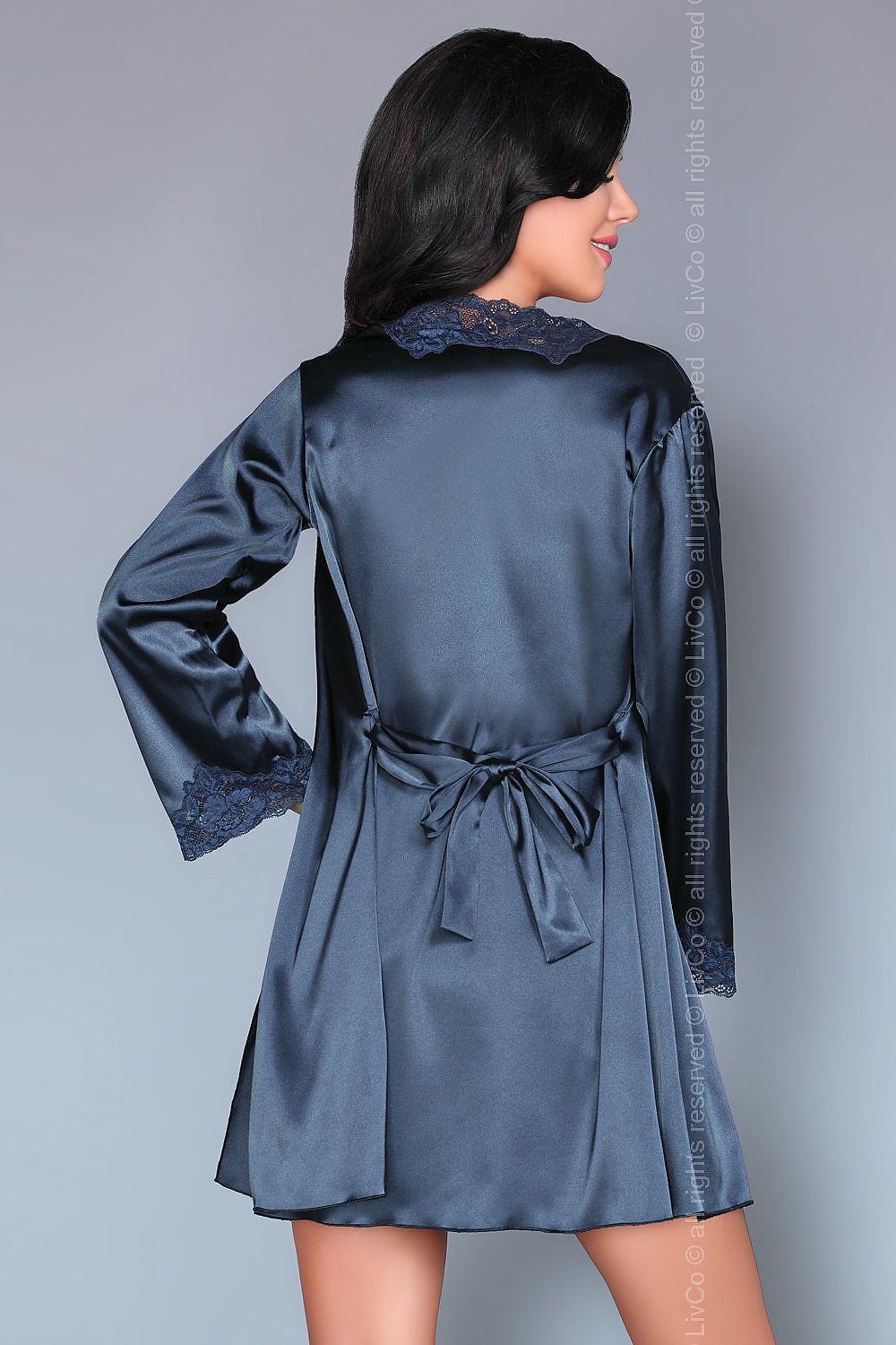 A three-piece nightwear set in a beautiful navy blue. Crafted from satin with a subtle sheen and finished with sensual, richly embroidered lace. The set includes a beautiful, feminine nightdress with adjustable straps, a dressing gown with a lace trim at the neckline, and a thong. It's a dream gift for someone or yourself!
