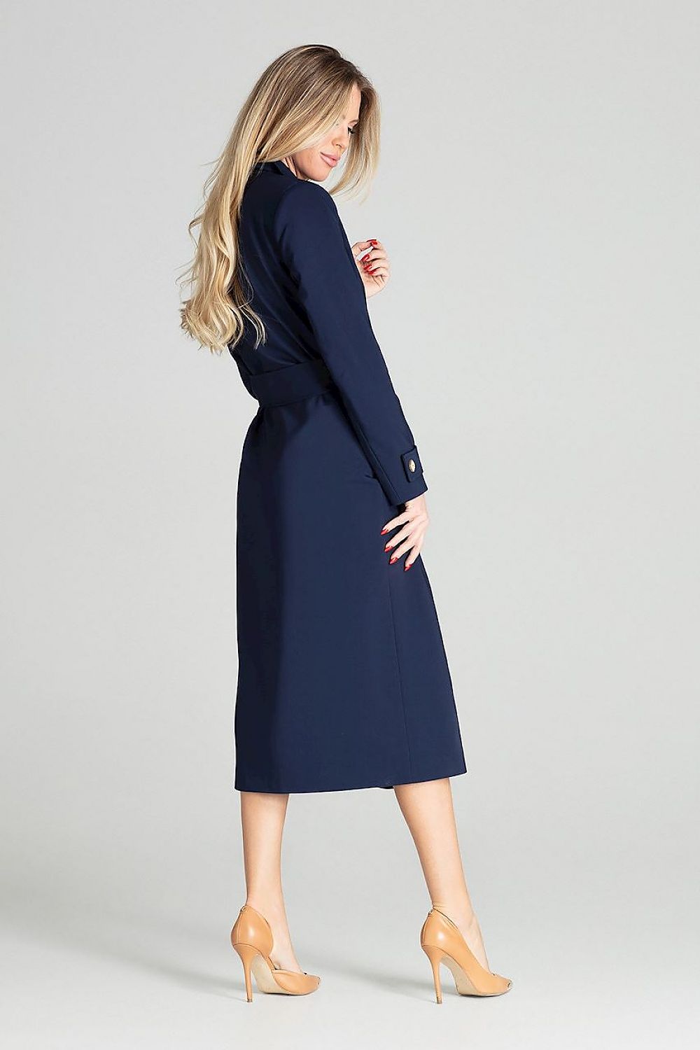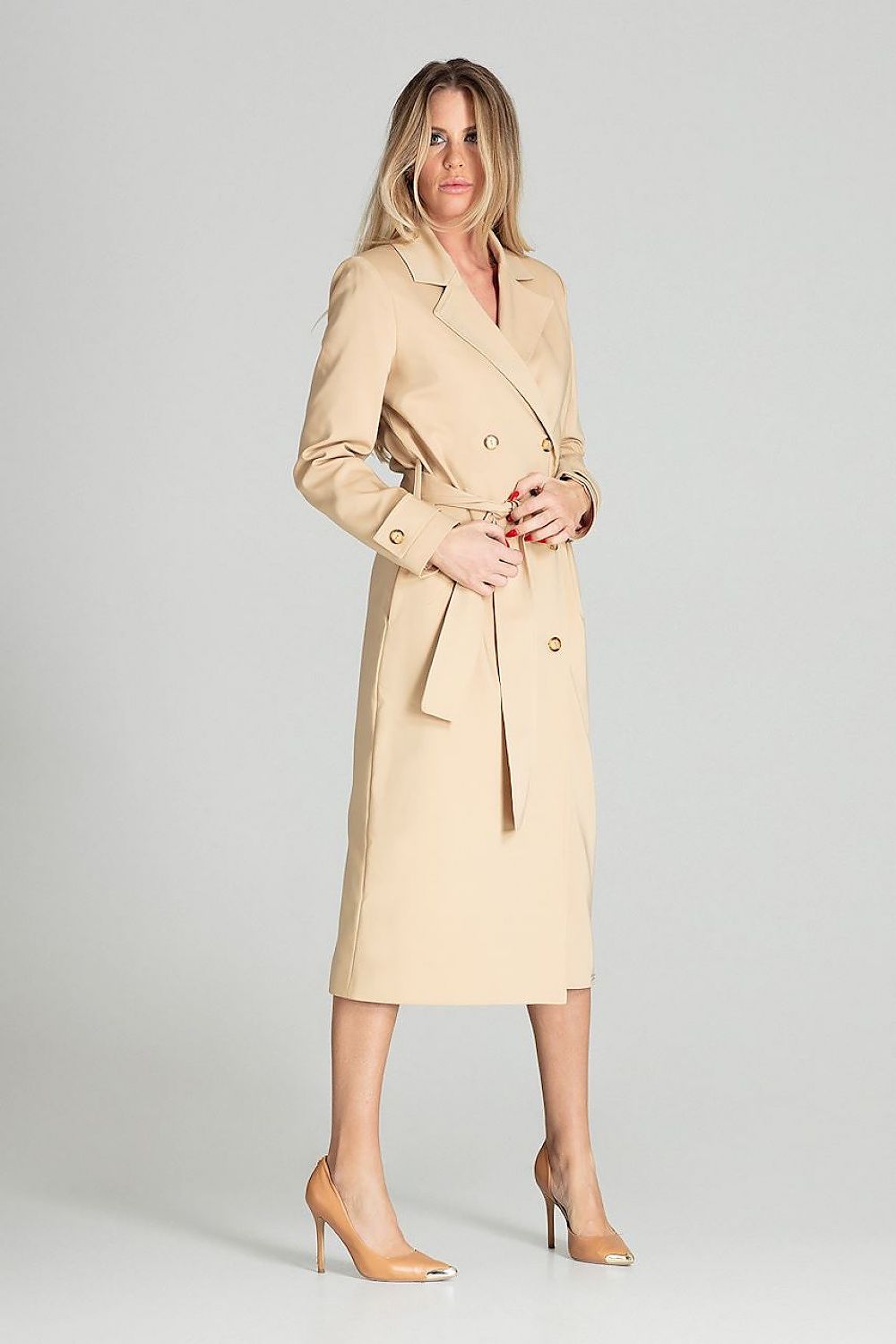 Long, classic beige spring coat with lining. Double-breasted, side seam pockets, and a tie at the waist.