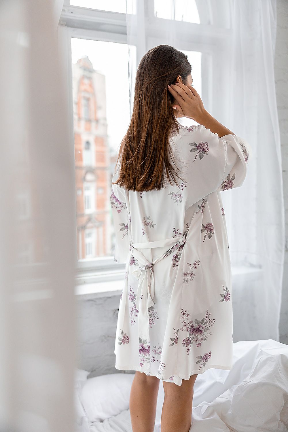 Incredibly feminine and luminous dressing gown in matte satin, pleasant to the touch. Covered in a print of subtle purple flowers. Elegant and stylish. Limited edition. 3/4 sleeves with pleated edges.