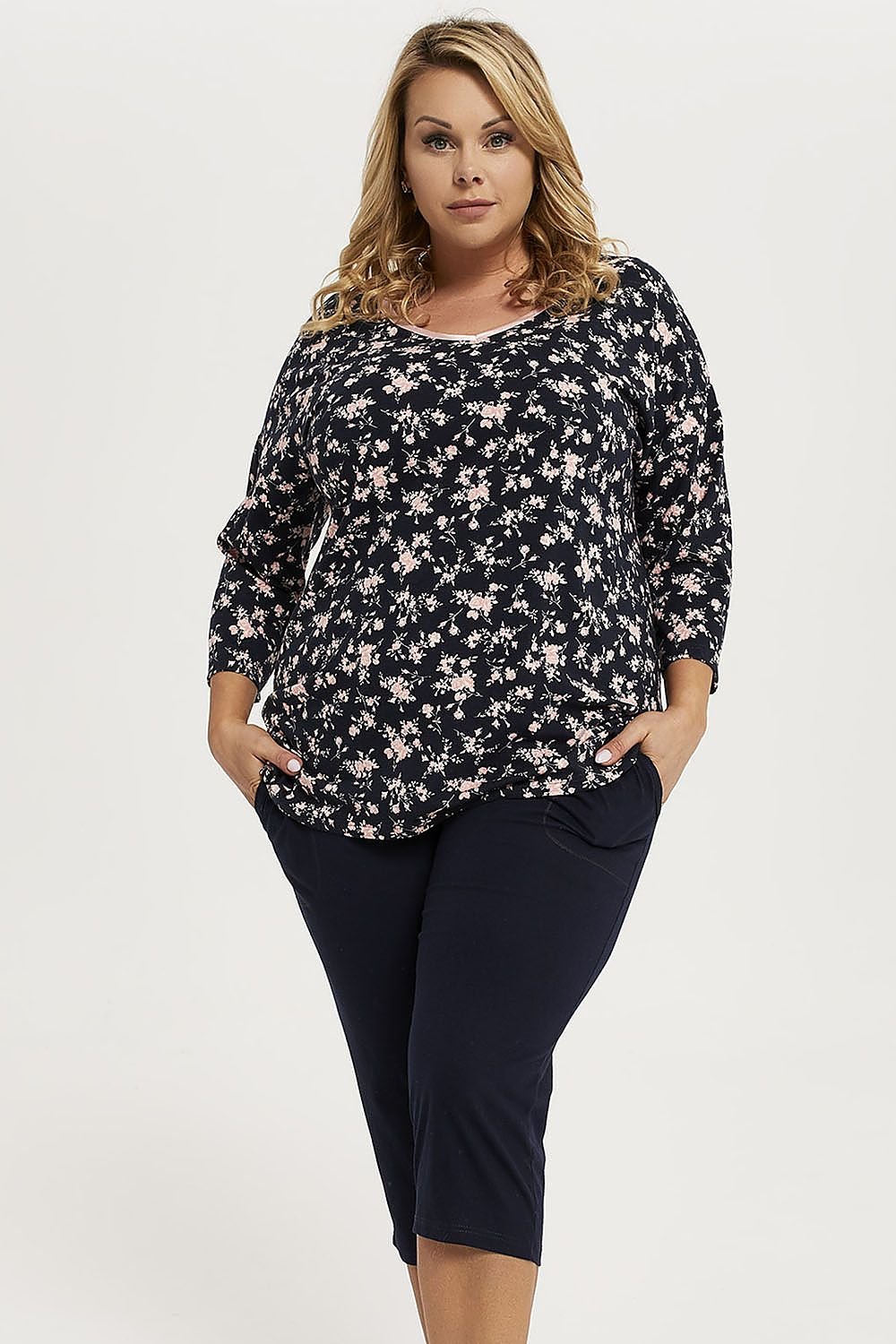 Loose-fitting women's pajamas consisting of a blouse and pants. Blouse with 3/4 sleeves and a round neckline. 3/4 pants with side pockets.