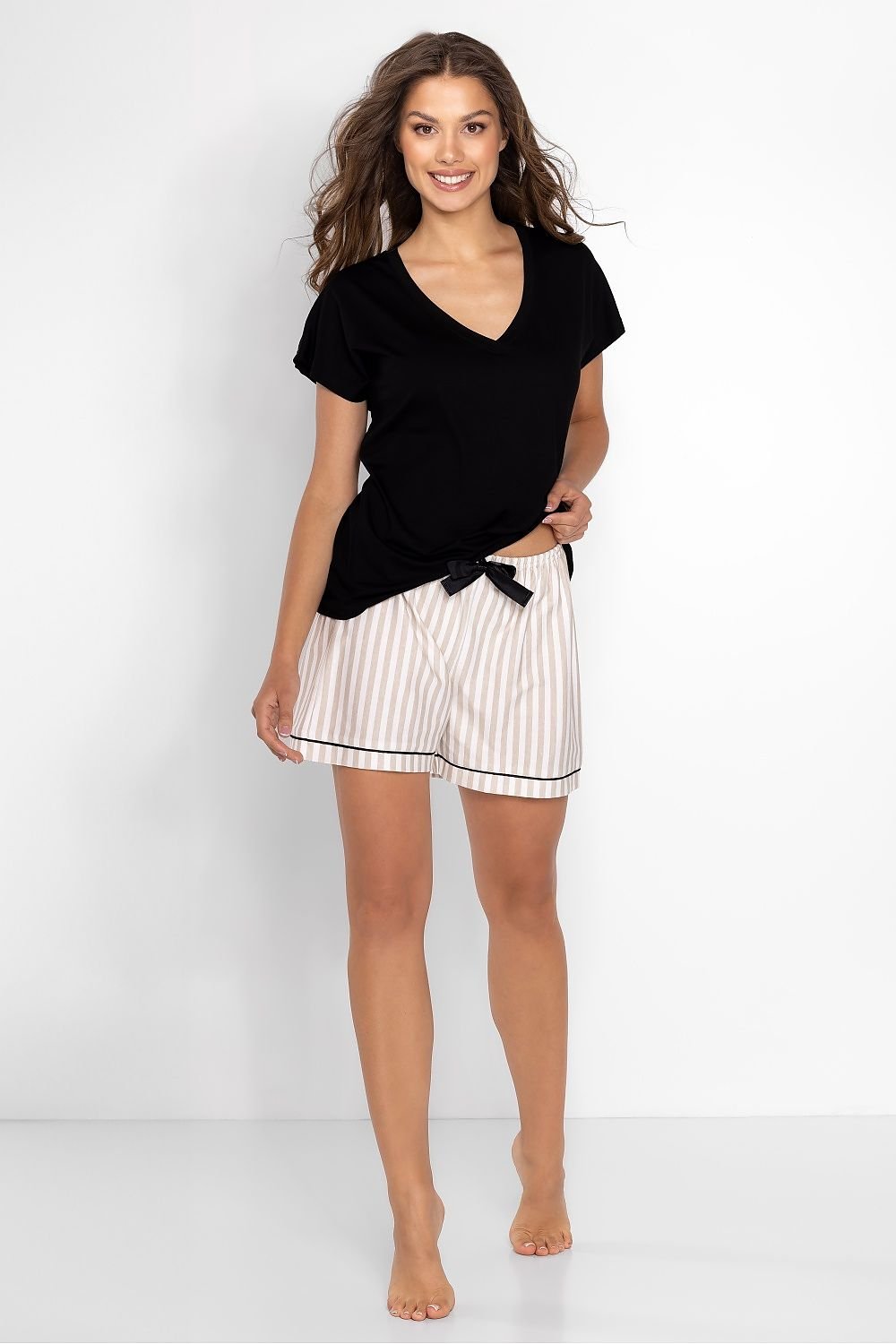 Women's pajamas consisting of a blouse and shorts. The blouse has short sleeves and a V-neck. The shorts are striped and have an elastic waistband and a decorative bow. The pajamas are made of a pleasant-to-the-touch fabric.