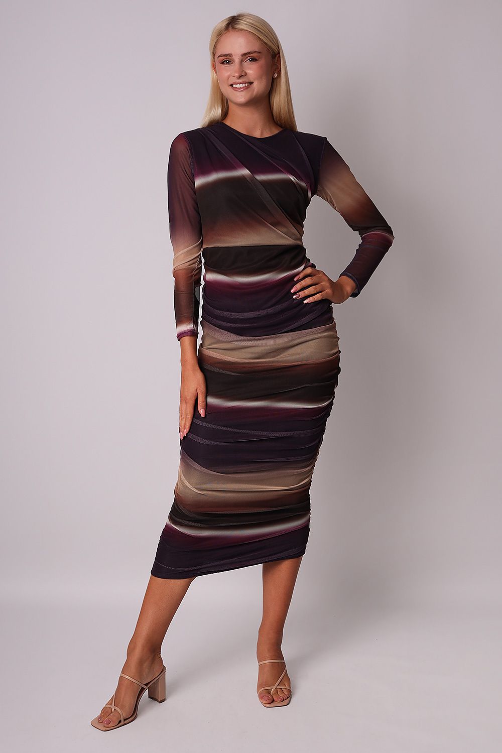 Look chic in our long-sleeved bodycon midi dress with a mesh print in abstract plum patterns. It features a ruffled top and a lined mesh midi skirt, long mesh sleeves, and a round neckline. Pair it with minimal jewelry and stiletto heels to complete your look!