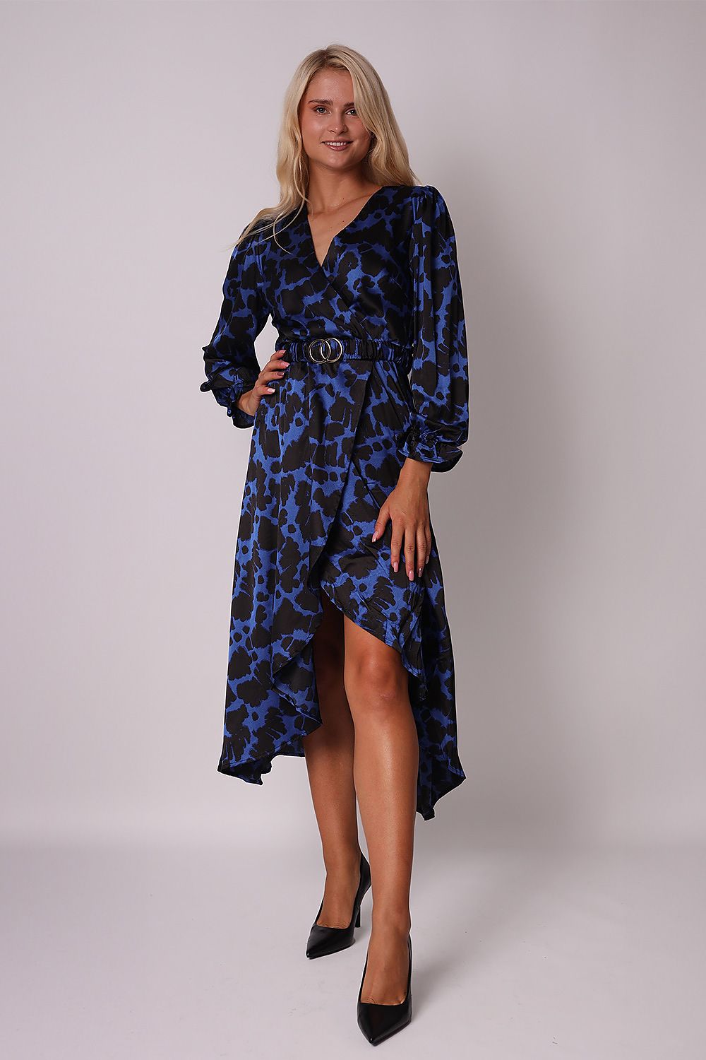 This cobalt black midi dress is incredibly sophisticated. It features long sleeves with elastic cuffs, a wrap front, a gold buckle belt, and a back zipper closure. Simply pair it with gold stilettos and accessories to complete your look.