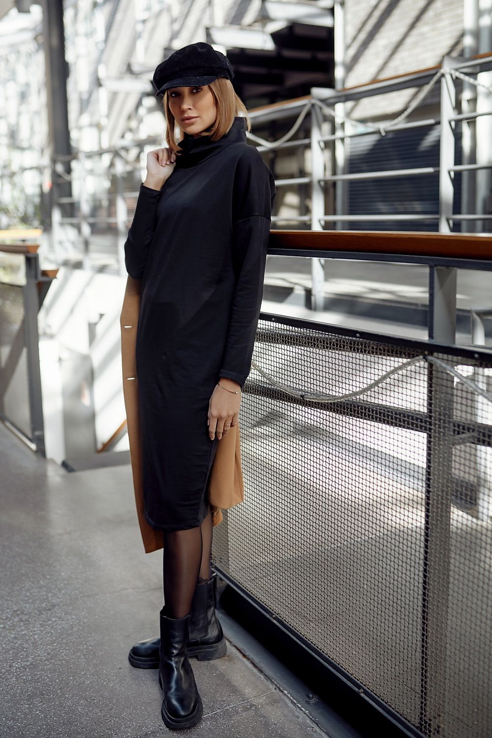 This loose-fitting black sports dress with long sleeves and a voluminous turtleneck is perfect for everyday wear. The dress features zippered pockets. The cut perfectly covers any imperfections in your figure.