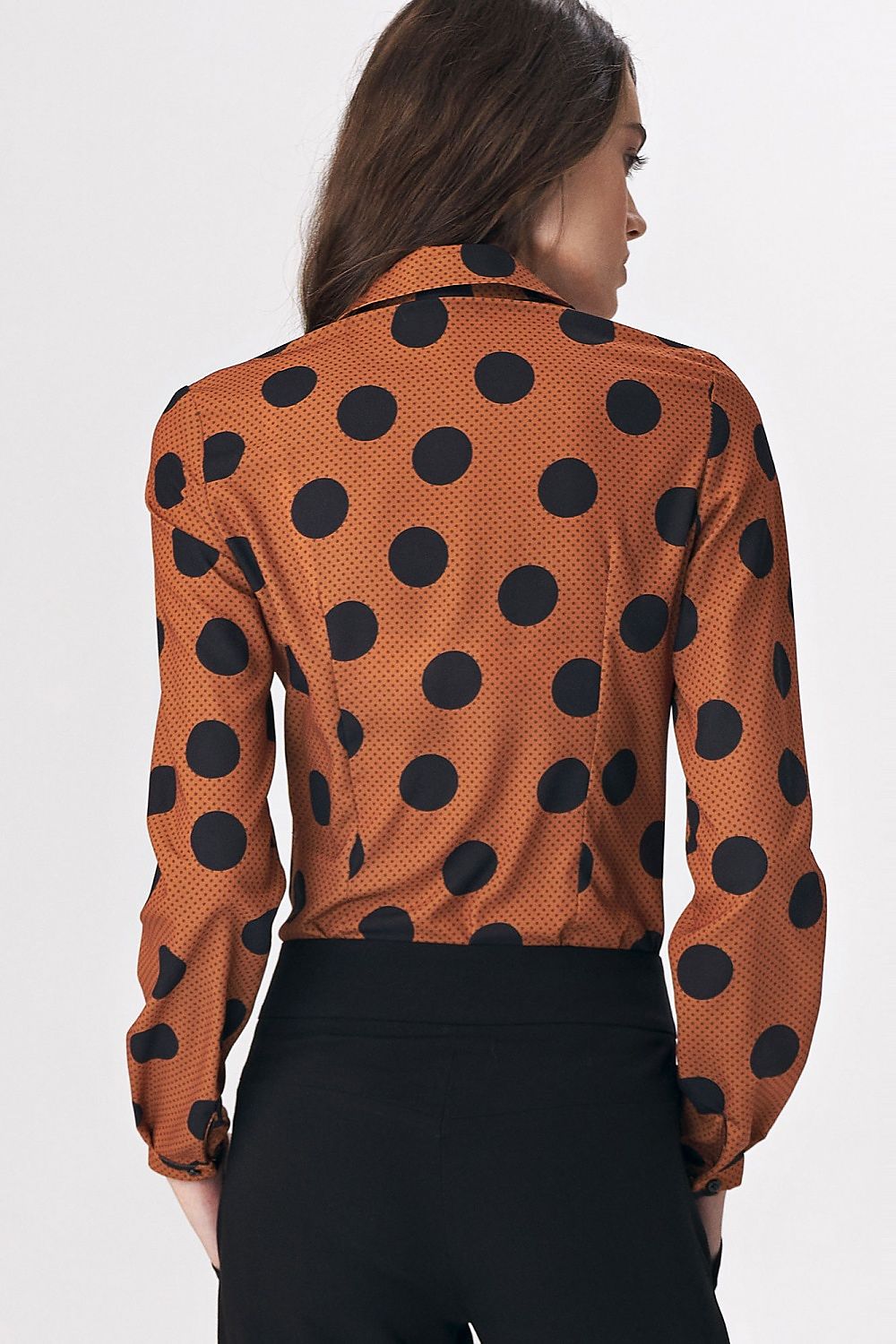 Le chemisier chemise est un véritable must-have pour les stylisations douces au bureau. Un mélange original de brun chaud et de noir et un motif à gros pois briseront le look classique du bureau. La coupe pratique du body s'adapte parfaitement au corps et vous permet de profiter non seulement d'un look impressionnant, mais aussi du confort tout au long de la journée.