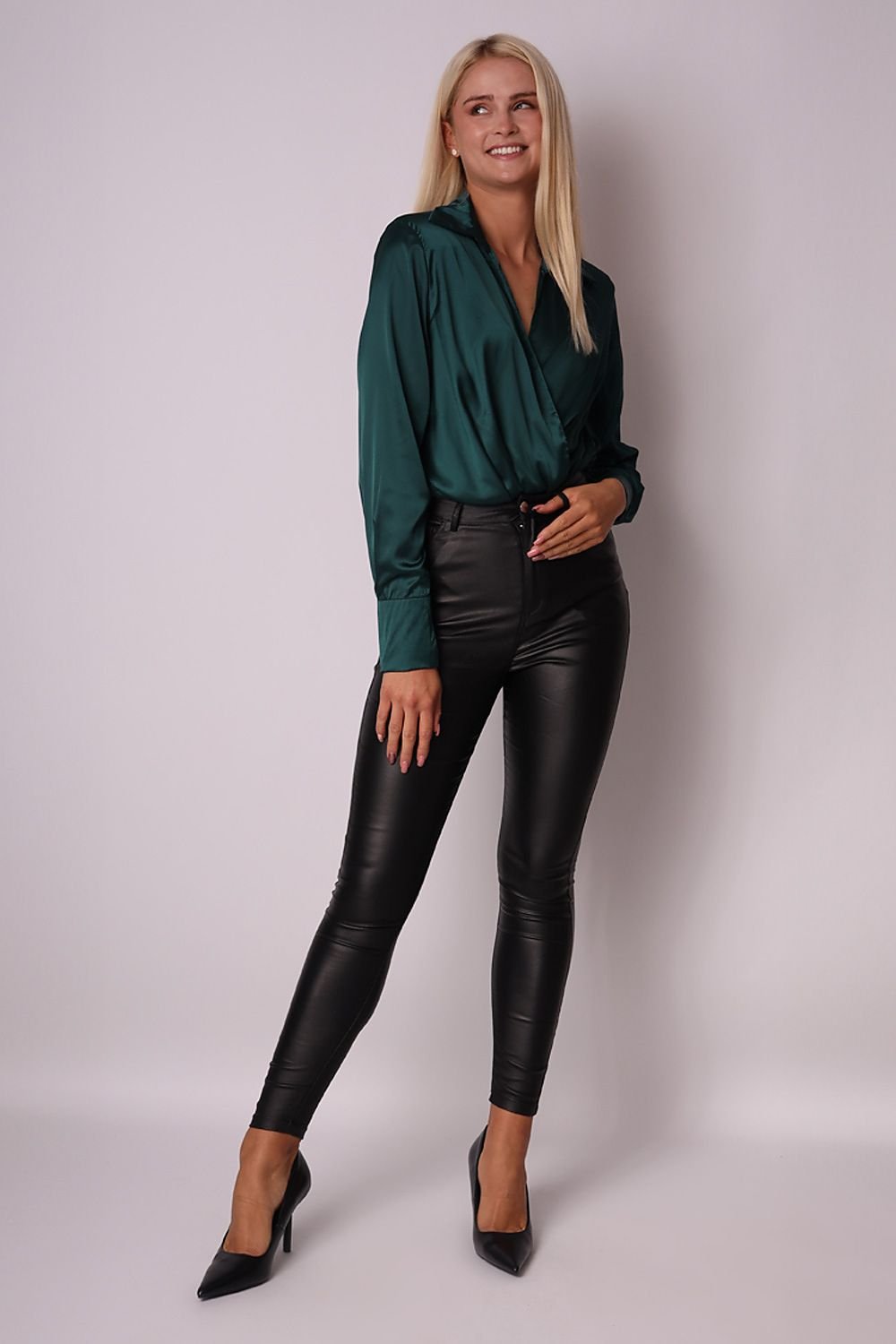 Démarquez-vous avec style dans notre body chemise en satin turquoise. Ce modèle enveloppant est doté de manches longues avec poignets, d'épaulettes, d'une encolure en V et d'un col classique. Associé à un pantalon en cuir et à des talons aiguilles, il créera le look de soirée parfait !