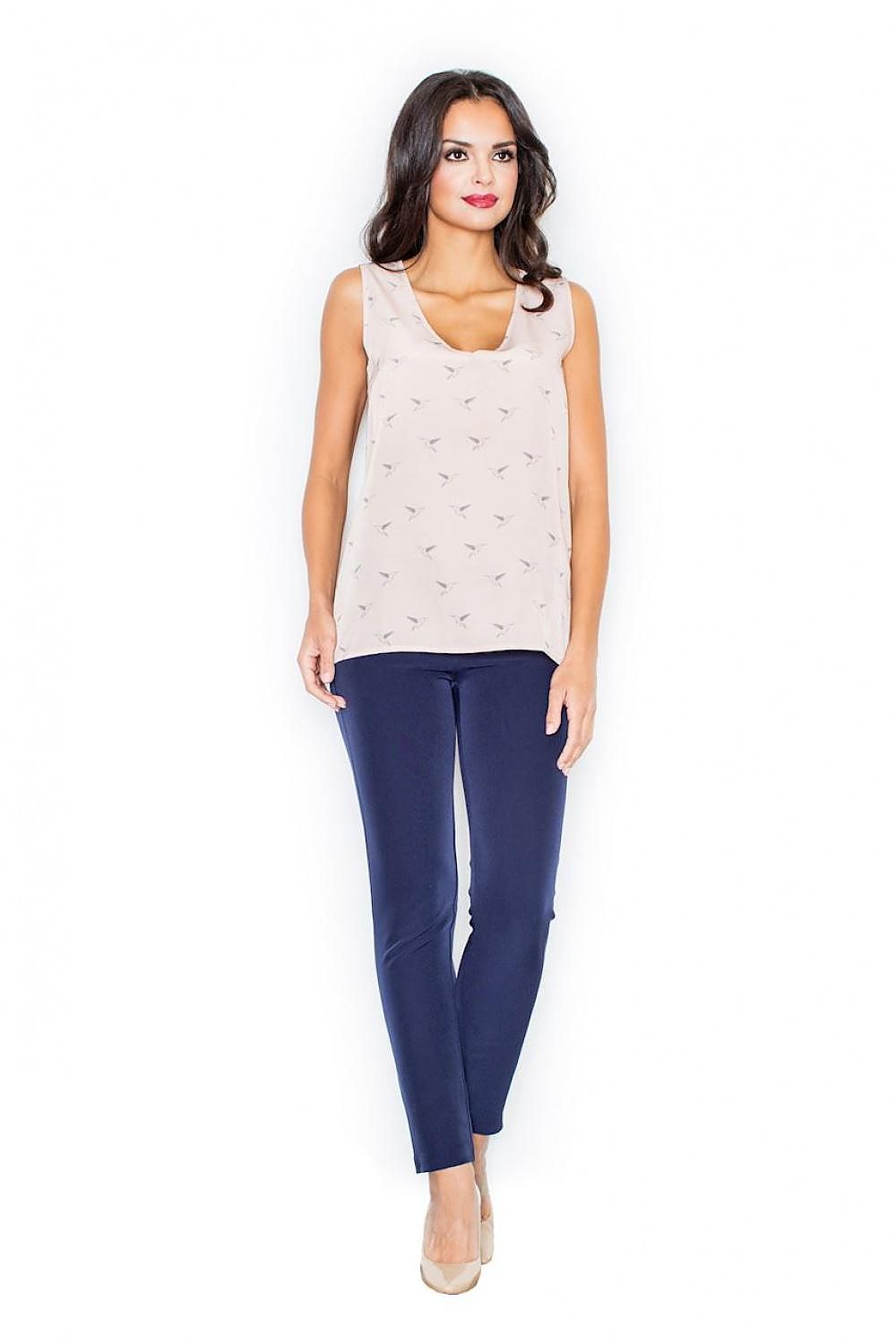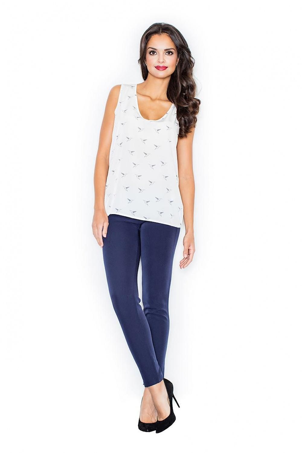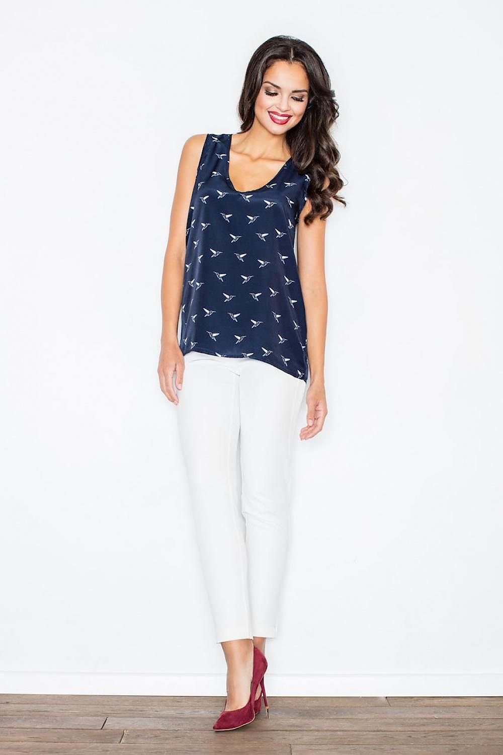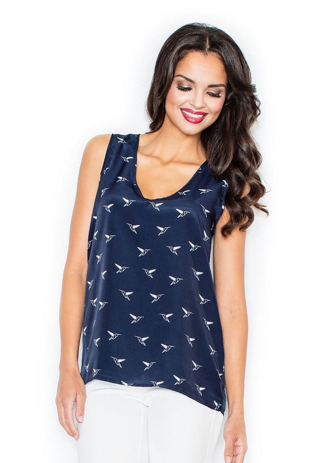 Blouse aérée avec de larges bretelles et un décolleté en cœur. Il présente un délicat motif d'oiseau. Parfait pour toute occasion.