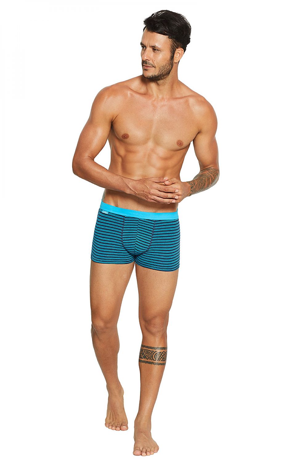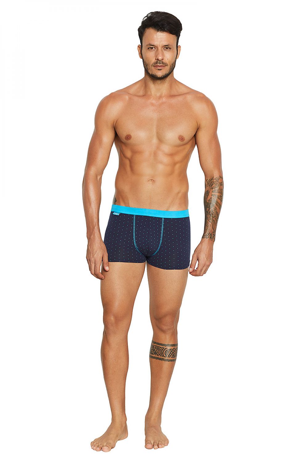 Jeu de 2 caleçons pour hommes en bleu marine. L'un rayé, l'autre à pois, tous deux garnis de fil contrastant. Tricot de coton doux. Ceinture avec bande élastique lisse.