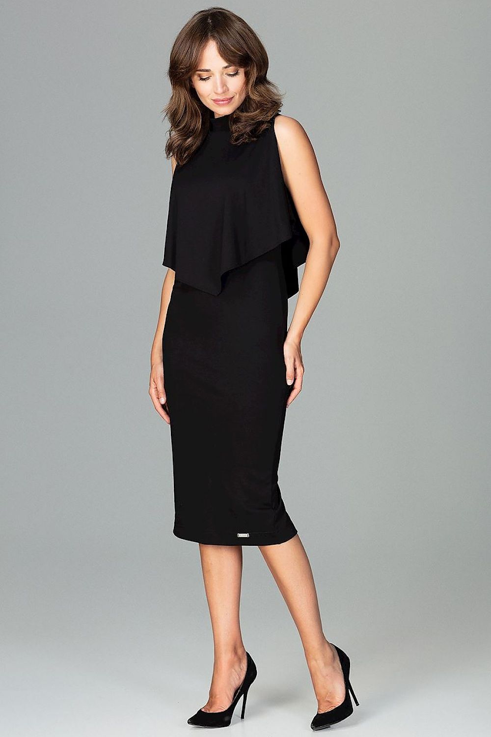 Une robe ajustée avec un col montant et une cape attachée. Idéal pour les grandes sorties et les dîners romantiques. Un avantage supplémentaire est le dos de la cape et une coupe confortable de la robe. Fermé par une fermeture éclair dissimulée dans le dos.