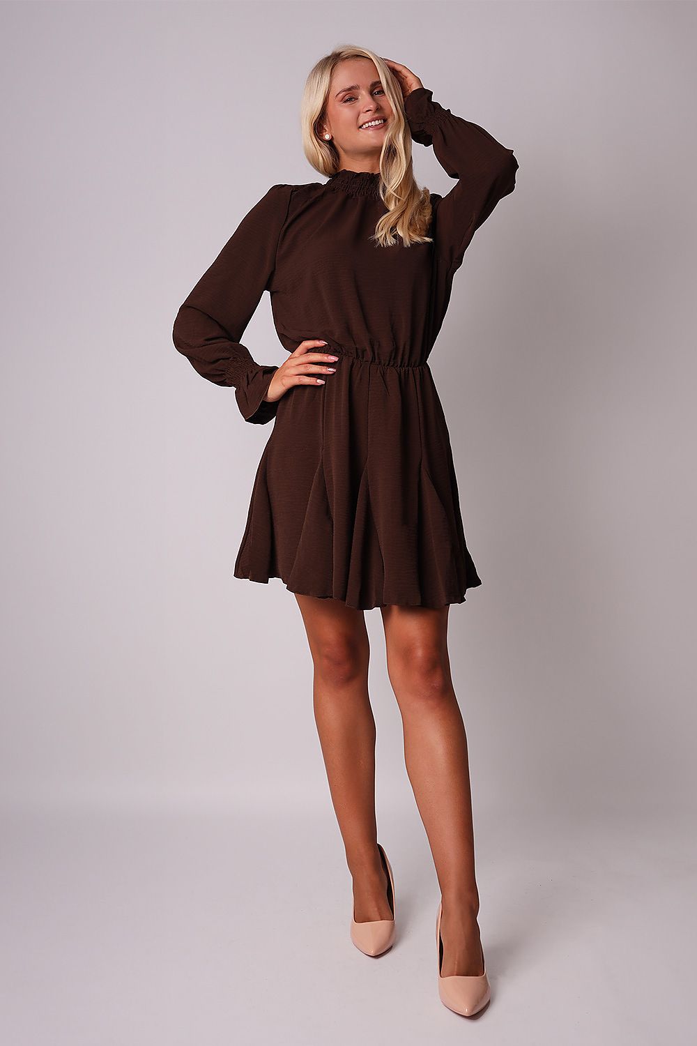 Cette robe patineuse aux détails froissés est un indispensable de la garde-robe. Elle présente un col à volants, des manches longues avec poignets à volants, une taille élastiquée et un ourlet évasé. Portez-la avec des talons aiguilles à lanières pour le soir ou des bottes pour la journée.